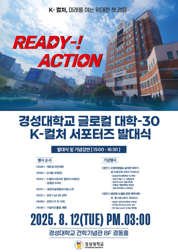 이번 행사는 경성대 글로컬대학30 사업의 핵심전략 주제인 'K-MEGA' 사업을 효율적으로 추진하기 위해 경성대학교가 추진하고 있는 글로컬대학에 대한 비전을 소개하고, 기념강연, K-POP 퍼포먼스 축하공연으로 진행된다.